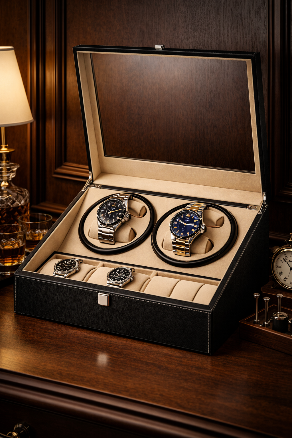 Le Coffret Maître-Horloger utilise un cycle de rotation bidirectionnel intelligent conçu pour respecter la mécanique de vos garde-temps.